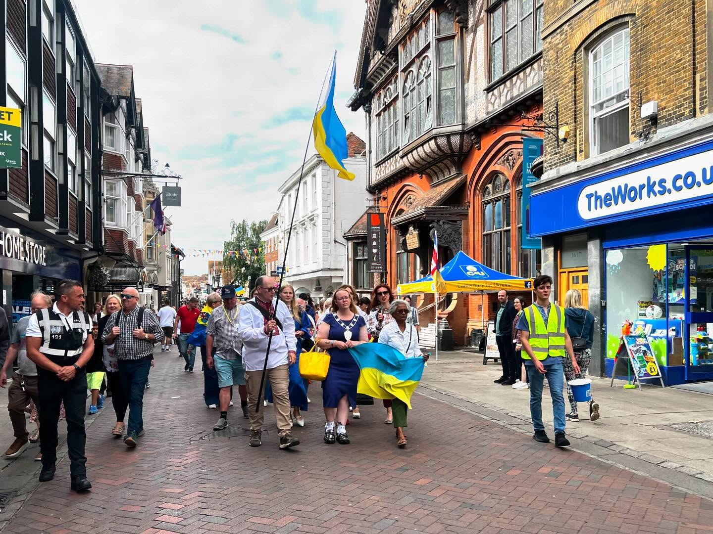 During the walk of solidarity through Canterbury’s city centre, the Ukrainian community sang well-known Ukrainian songs, while passersby smiled at them and politely gave way. Blue and yellow flags were waved proudly, symbolising mutual respect and shared values.