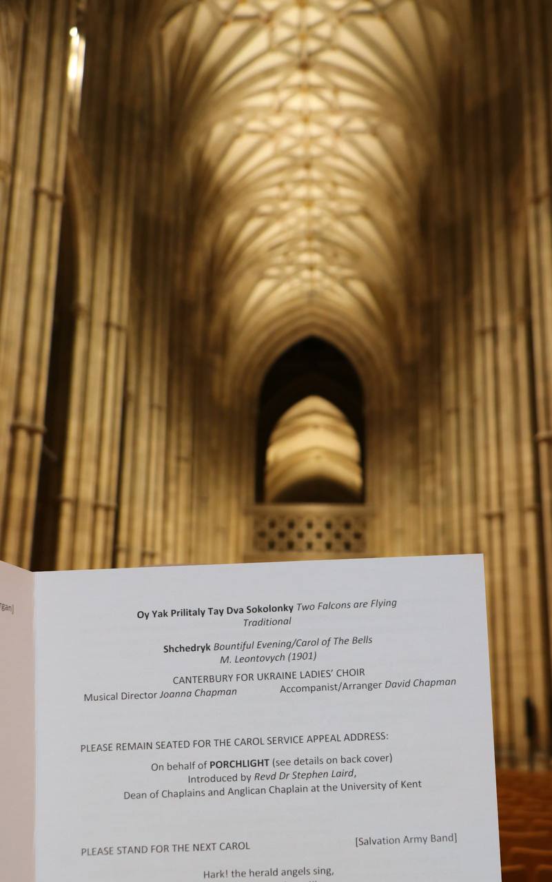 We performed two Ukrainian carols: the world-famous Shchedryk (“Carol of the Bells”) and. Two falcons are flying. We believe this was the first time Ukrainian Shchedryk was sung in Canterbury Cathedral by Ukrainians.